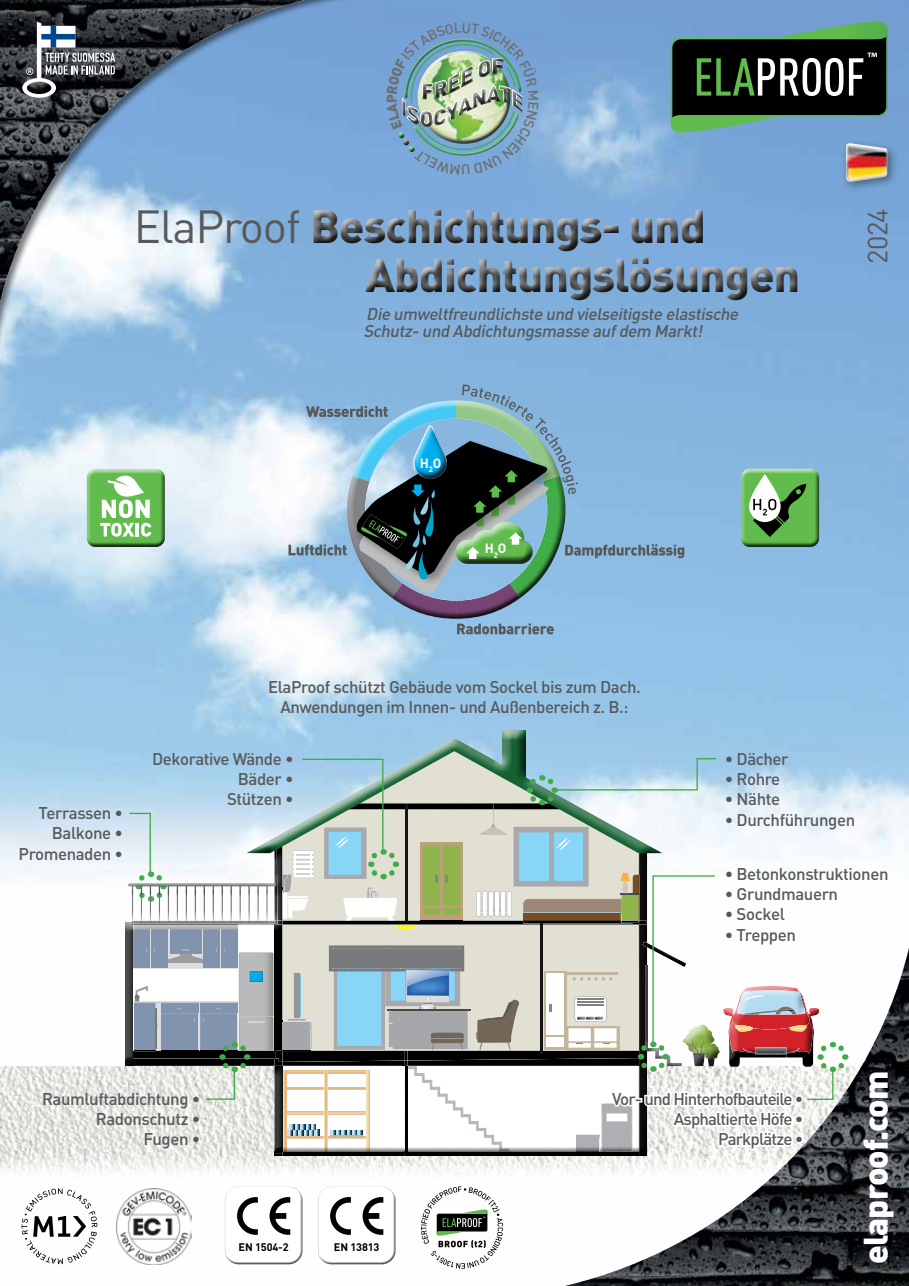 ElaProof Indoor ist eine gebrauchsfertige, einkomponentige, wasserbasierte Beschichtung zur luftdichten Abdichtung im Innenbereich sowie zum Schutz vor Radon. Die besondere Elastizität und die sehr gute Haftung auf unterschiedlichen Untergründen gewährleisten eine zuverlässige und dauerhafte Abdichtung.