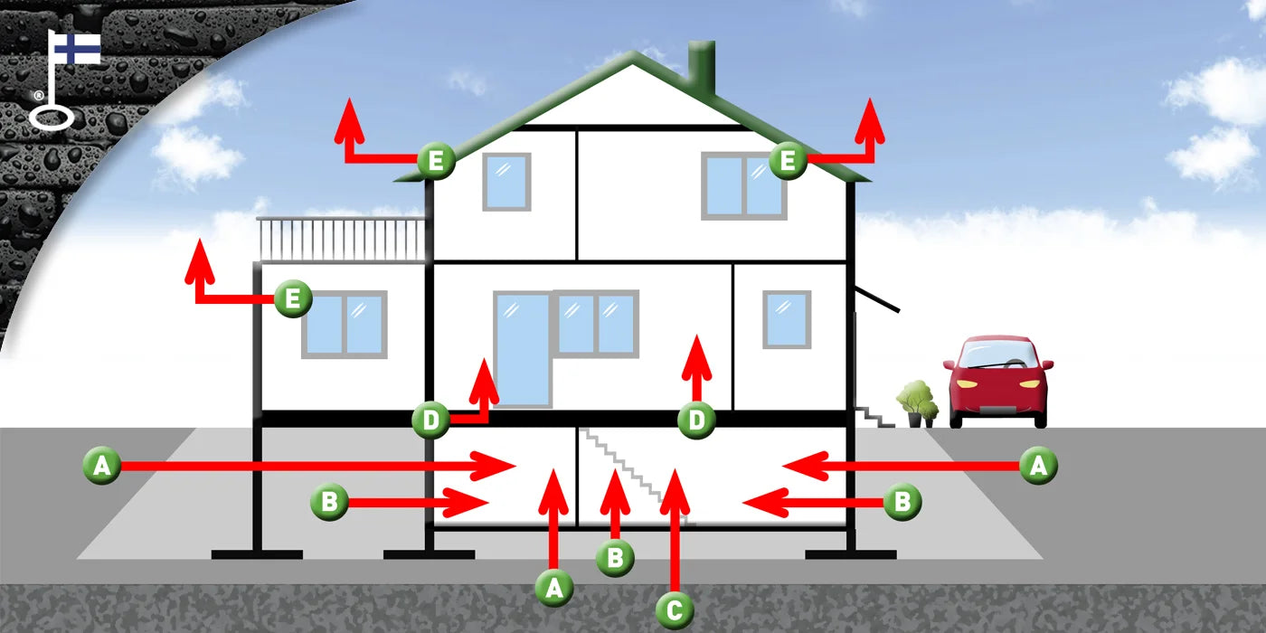 Der häufigste Leckageweg ist die Schwindfuge zwischen Betonbodenplatte und Sockel, durch die der Unterdruck in der Wohnung radonhaltige Bodenluft ansaugt. Darüber hinaus können auch Durchdringungen und verschiedene Anschlussstellen bedeutende Leckagepfade für radonhaltige Luft darstellen.